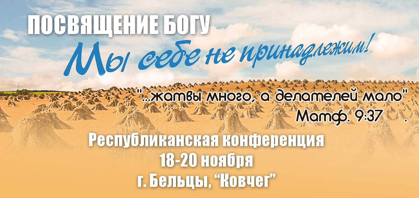 Дорогие братья и сестры мир вам! Искренне рады пригласить вас на конференцию «Посвящение Богу», которая пройдет в церкви «Ковчег» г. Бельцы с 18 по 21 ноября. Основные докладчики конференции: Епископ Союза церквей ЕХБ Ион Мирон Пастор церкви «Вифания» г. Кишинев,…